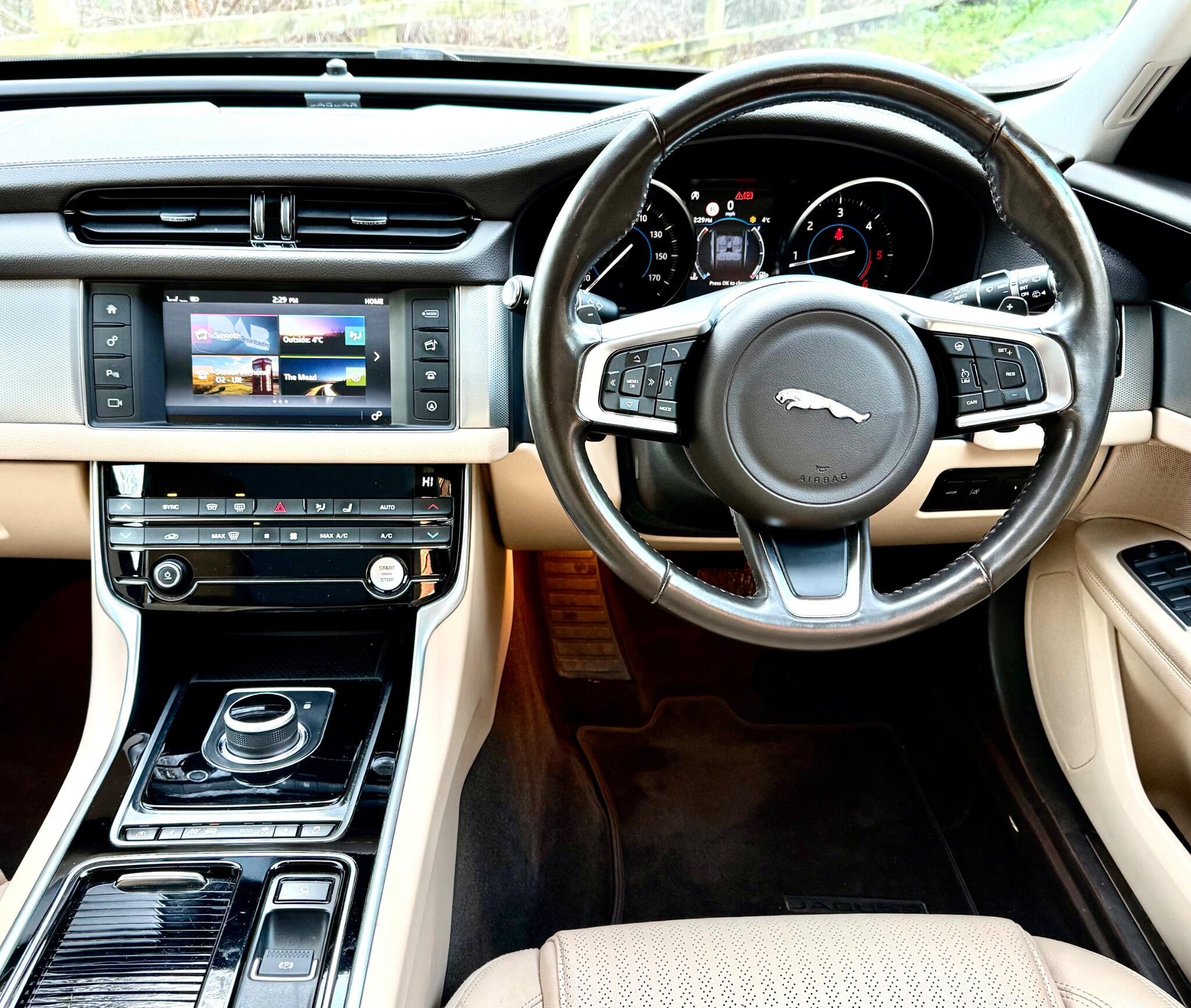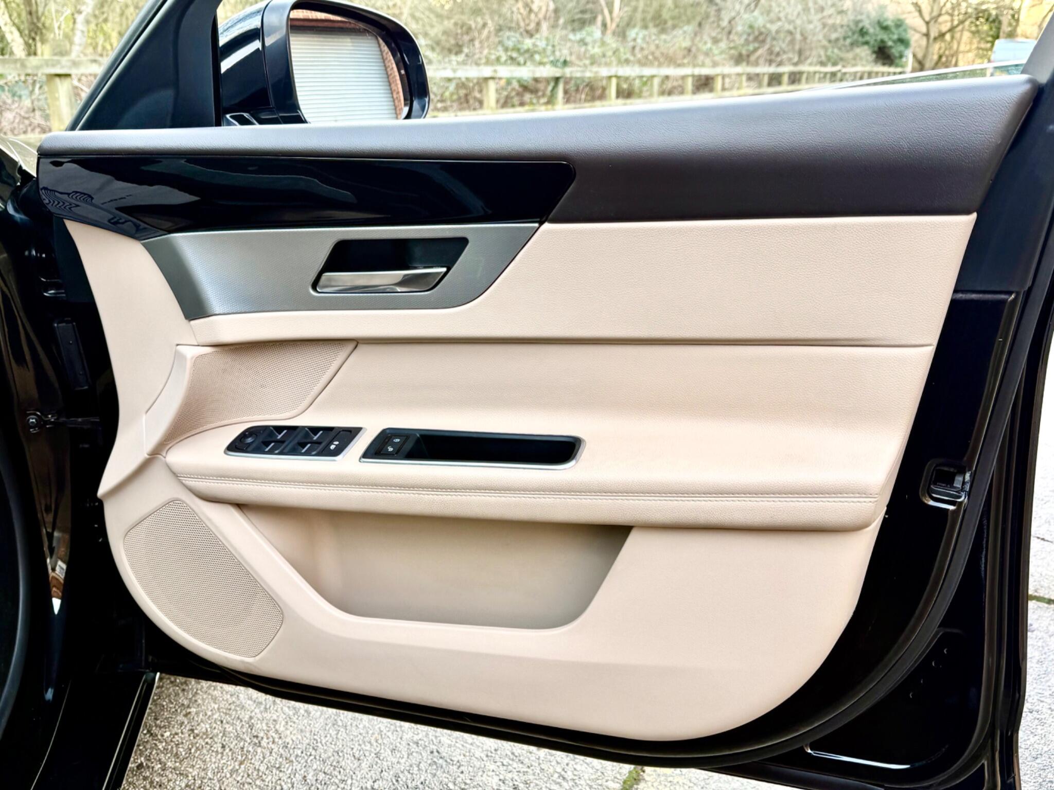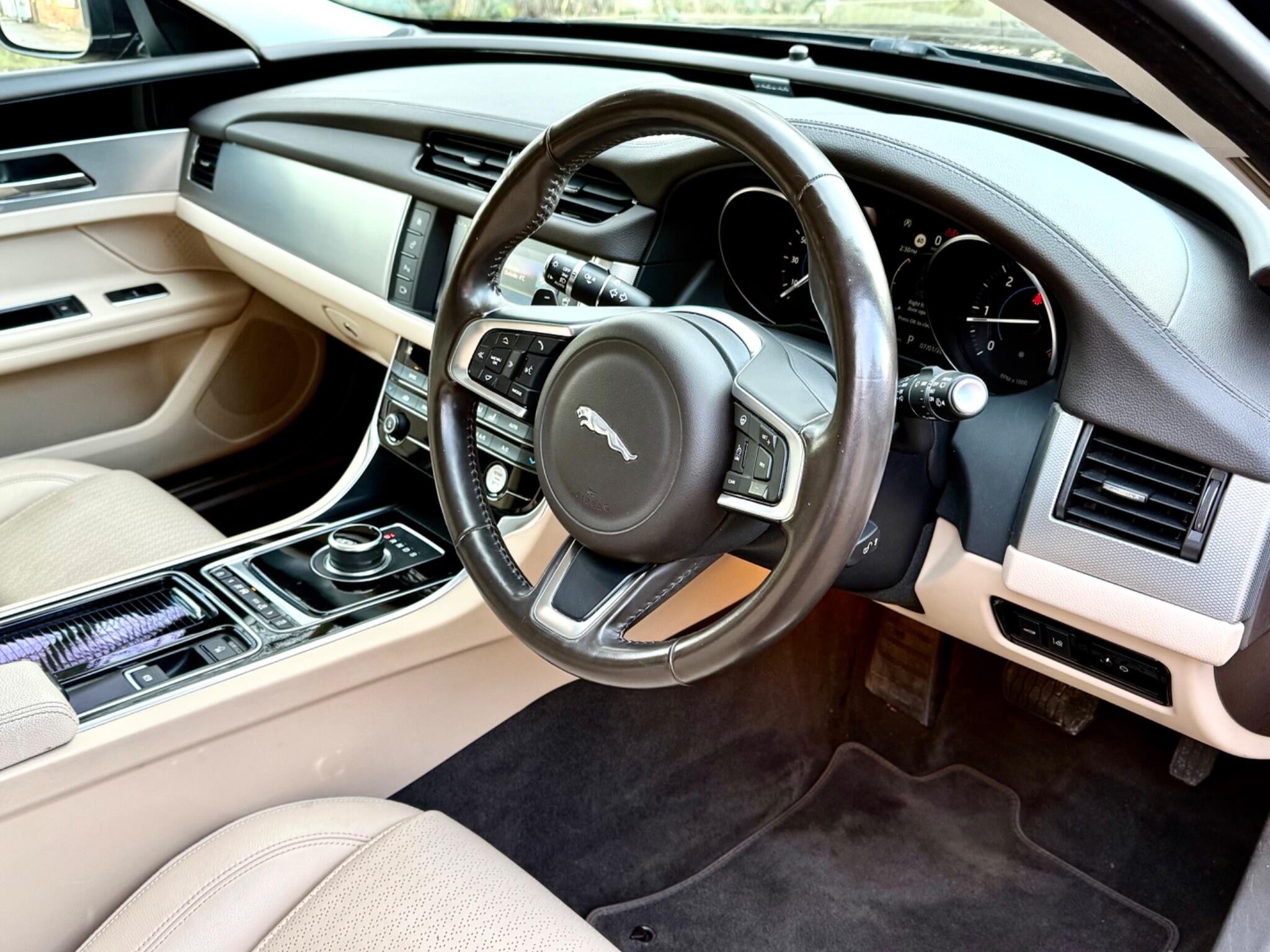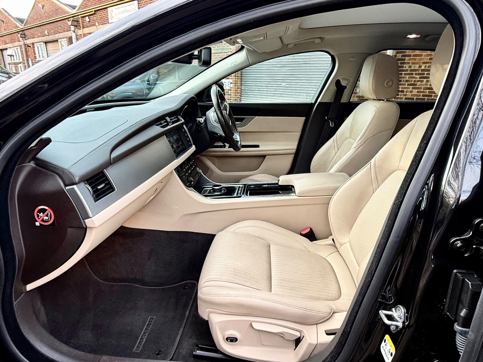 At time of advertising this is a one of a kind. Finished in Black with Beige Leather upholstery this 2018 Jaguar XF d Prestige boasts exceptionally low mileage for its age, having covered just 47,000 miles and has a Full Service History with the last service at 43,335 miles in May of 2025. This sophisticated saloon features a powerful 2.0L diesel engine paired with a smooth automatic transmission and a capable four wheel drive system, ensuring confident performance in all conditions. The Prestige trim level offers a refined interior experience, enhanced by the convenience of automatic headlights, including Xenon headlights with a distinctive LED signature, and the comfort of heated front seats. Enjoy a consistently pleasant cabin environment thanks to the 2 zone climate control and a bright and airy feel with the Panoramic fixed Glass Roof. Bluetooth Telephone Connectivity means you can make and receive calls while keeping both hands on the Multi-function steering wheel where you will also find the controls for audio and Cruise control. Navigation System with 8in Touchscreen assists in getting to the correct location first time.
