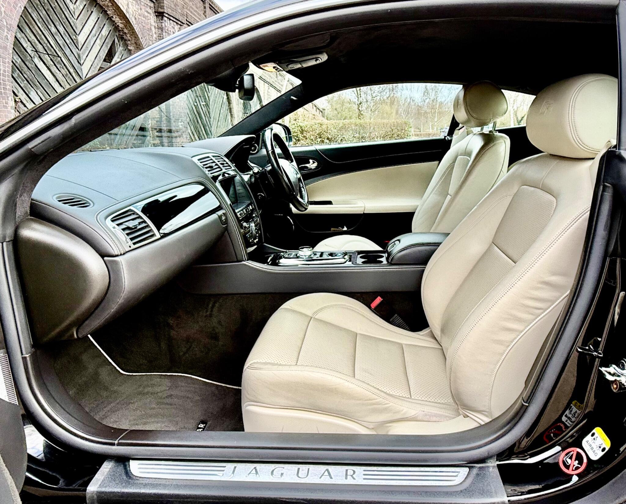 Finished in Ultimate Black metallic with contrasting Ivory Leather this 2014 Jaguar XKR V8 boasts a full service history and has had only three owners, with the last owner since 2016.last service carried out at 50,199 miles in January 2025 and will be serviced befor delivery.offering excellent provenance. Under the bonnet, you'll find a powerful 5.0L petrol engine, paired with a smooth automatic transmission. Inside, the cabin is appointed with 16x16 way electric performance seats for optimal comfort and support. Enjoy a consistently pleasant environment thanks to the dual zone automatic climate control, and navigate tight spots with ease using the front parking aid, complete with a touch screen visual indicator. The car also features bi-function HID Xenon headlights with LED daytime running lights, and automatic headlight activation for enhanced visibility. Never get lost with the Satellite Navigation system. Multi-Function steering wheel with Paddle Shift and Cruise control.