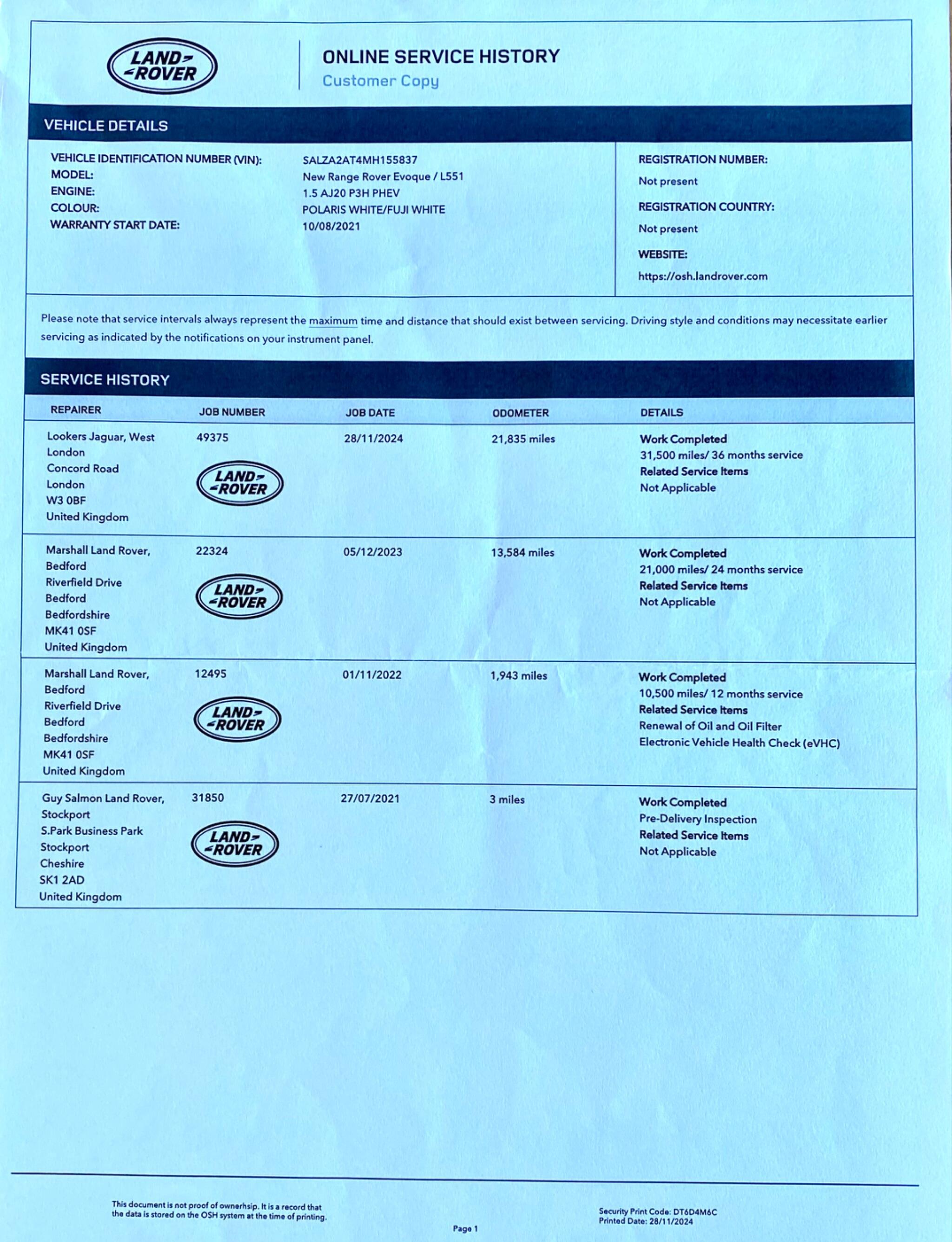 Finished in Fuji White with Black Leather Upholstery this 2021 Land Rover Range Rover Evoque P300e R Dynamic S boasts exceptionally low mileage for its year, having covered just 27,000 miles and with a Full Land Rover Service History. As a Euro 6 compliant model, it features a 1.5 litre petrol plug in hybrid engine paired with four wheel drive, offering an efficient yet capable driving experience. Inside, you'll find comfortable 12 way heated electric front seats with two way manual headrests, and convenient Bluetooth connectivity for seamless phone integration. The R Dynamic S trim also benefits from striking LED headlights and a sophisticated two zone climate control system to ensure comfort for all occupants. You also get 10in Touchscreen with